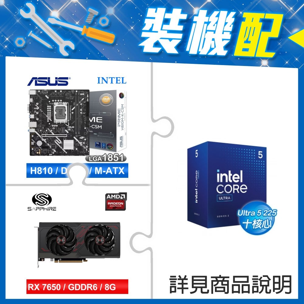 ☆裝機配★ Core U5 225+華碩 PRIME H810M-K-CSM D5 MATX主機板+藍寶石 黑鑽版 RX 7650 GRE GAMING OC 8GB 顯示卡