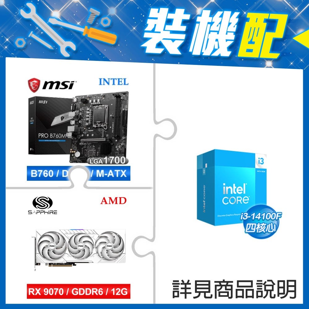 ☆裝機配★ i3-14100F+微星 PRO B760M-E D5 MATX主機板+藍寶石 PURE 極地 RX 9070 GRE GAMING OC 12GB 顯示卡
