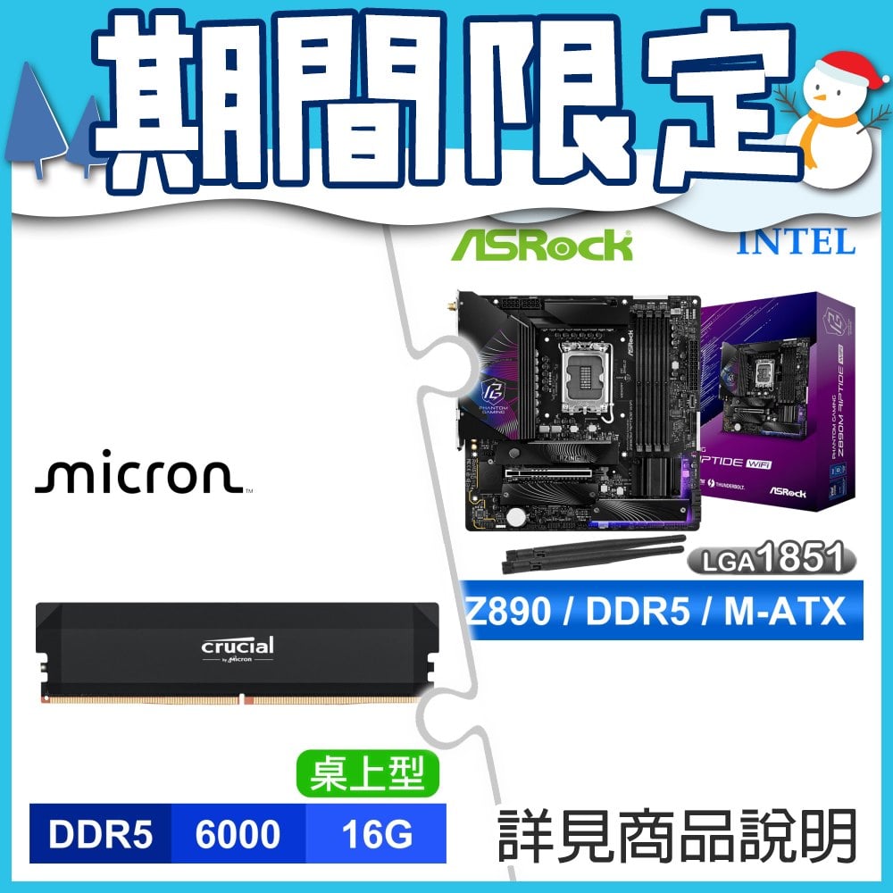 ☆期間限定★ 華擎 Z890M Riptide WiFi D5 M-ATX主機板+美光 Crucial PRO DDR5 6000 16G CL36 黑 記憶體★送TESORO 羅貝拉劍RGB 青軸 中 電競鍵盤+ZOWIE FK1+-B 電競滑鼠《黑》