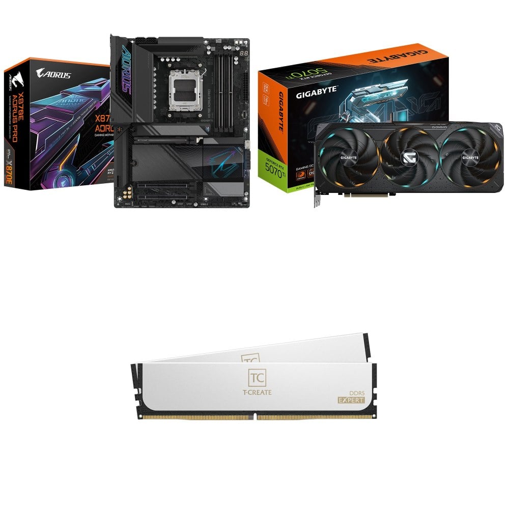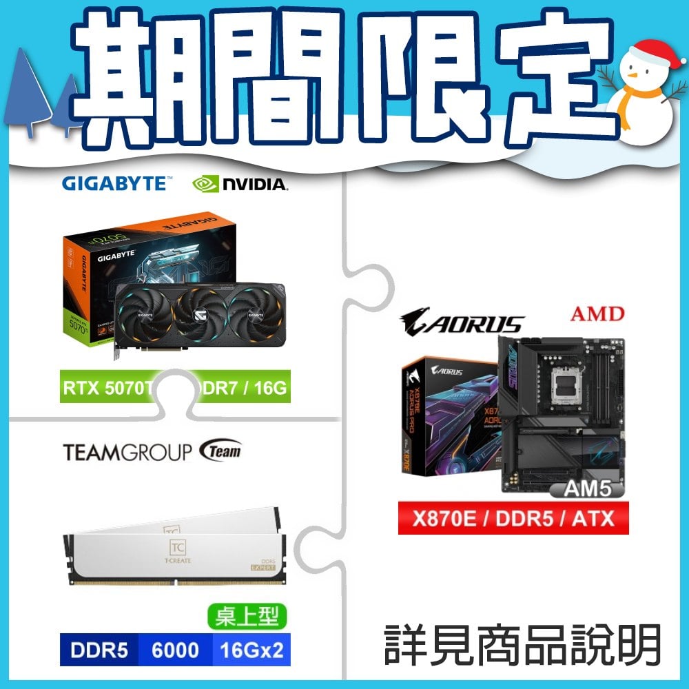 ☆期間限定★ 技嘉 X870E AORUS PRO ATX主機板+技嘉 RTX 5070 Ti GAMING OC 16G 顯示卡+TEAM 十銓T-CREATE EXPERT D5 6000 16G*2白 記憶體
