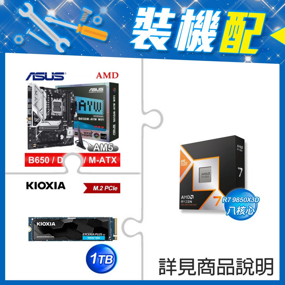 ☆裝機配★ AMD R7 9850X3D+華碩 B650M-AYW WIFI MATX主機板+鎧俠 EXCERIA PLUS G3 1TB PCIe Gen4x4 SSD