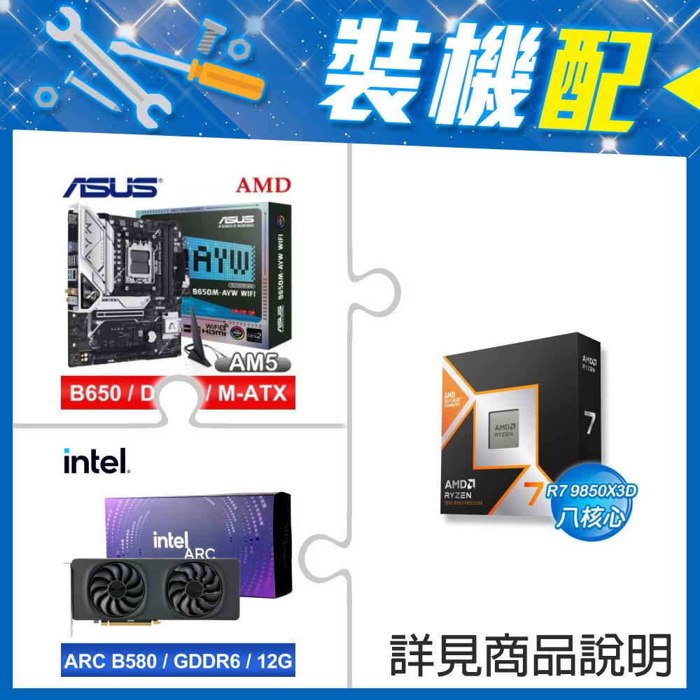 ☆裝機配★ AMD R7 9850X3D+華碩 B650M-AYW WIFI MATX主機板+Intel Arc B580 12G 20 Core 顯示卡