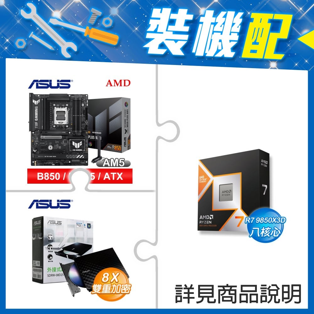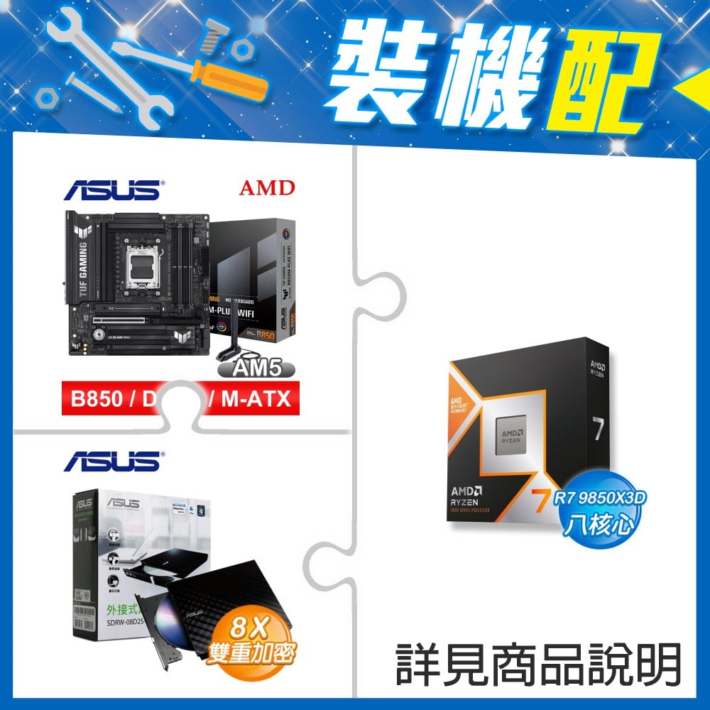 ☆裝機配★ AMD R7 9850X3D+華碩 TUF GAMING B850M-PLUS WIFI MATX主機板+華碩 SDRW-08D2S-U 外接式燒錄機《黑》