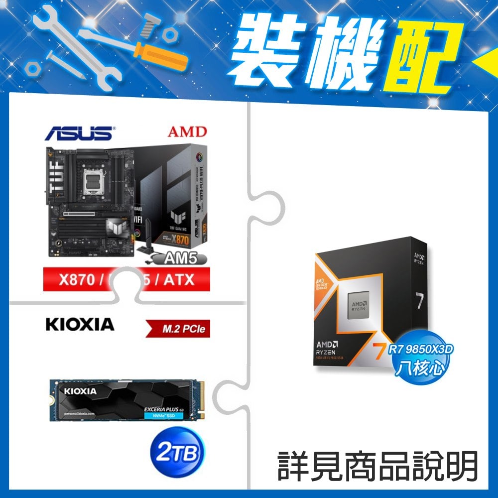 ☆裝機配★ AMD R7 9850X3D+華碩 TUF GAMING X870-PLUS WIFI ATX主機板+鎧俠 EXCERIA PLUS G3 2TB PCIe Gen4x4 SSD