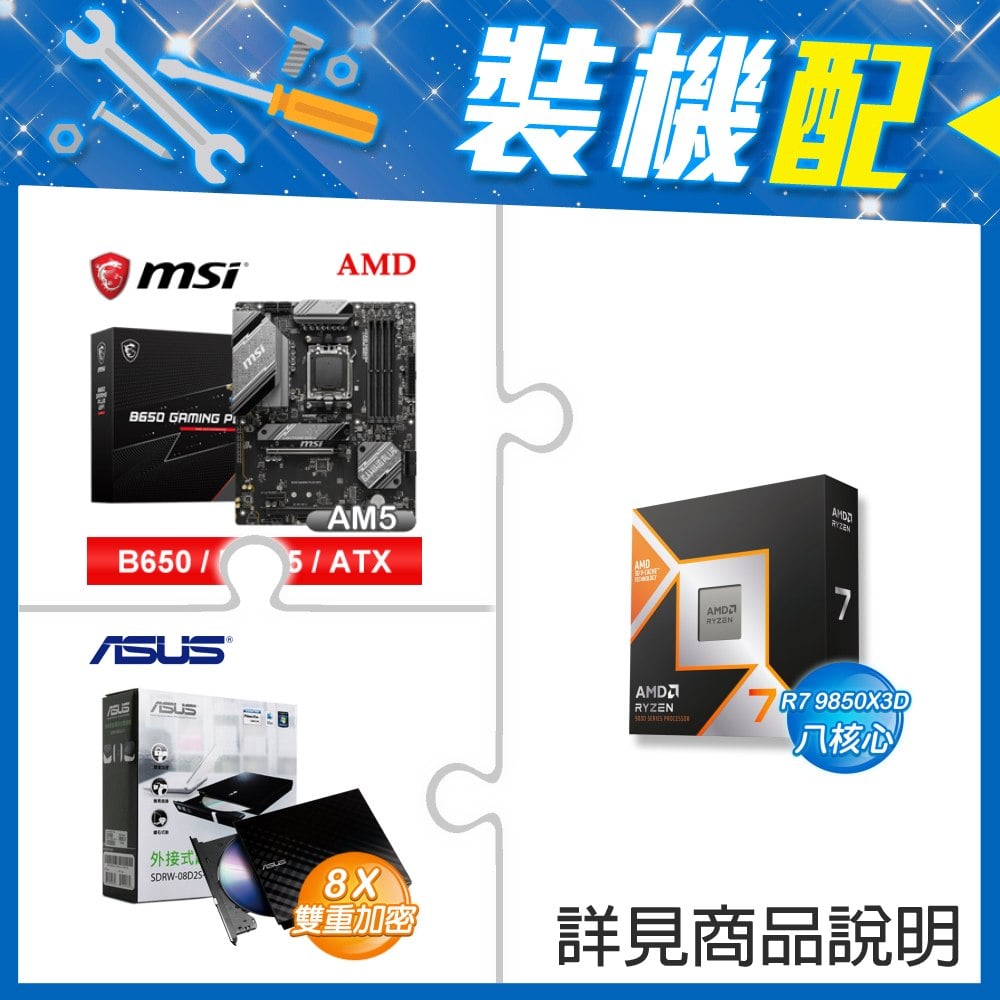 ☆裝機配★ AMD R7 9850X3D+微星 B850 GAMING PLUS WIFI ATX主機板+華碩 SDRW-08D2S-U 外接式燒錄機《黑》