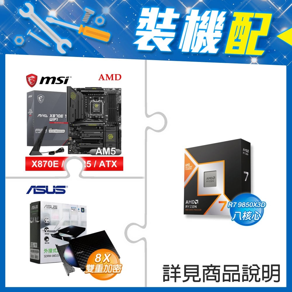 ☆裝機配★ AMD R7 9850X3D+微星 MAG X870E TOMAHAWK WIFI ATX主機板+華碩 SDRW-08D2S-U 外接式燒錄機《黑》