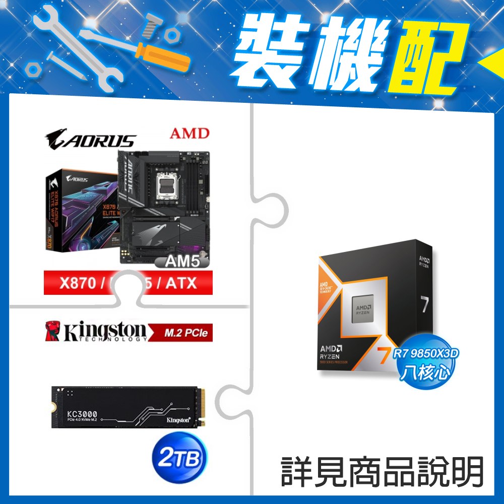 ☆裝機配★ AMD R7 9850X3D+技嘉 X870 AORUS ELITE WIFI7 ATX主機板+金士頓 KC3000 2TB PCIe 4.0 NVMe M.2 SSD
