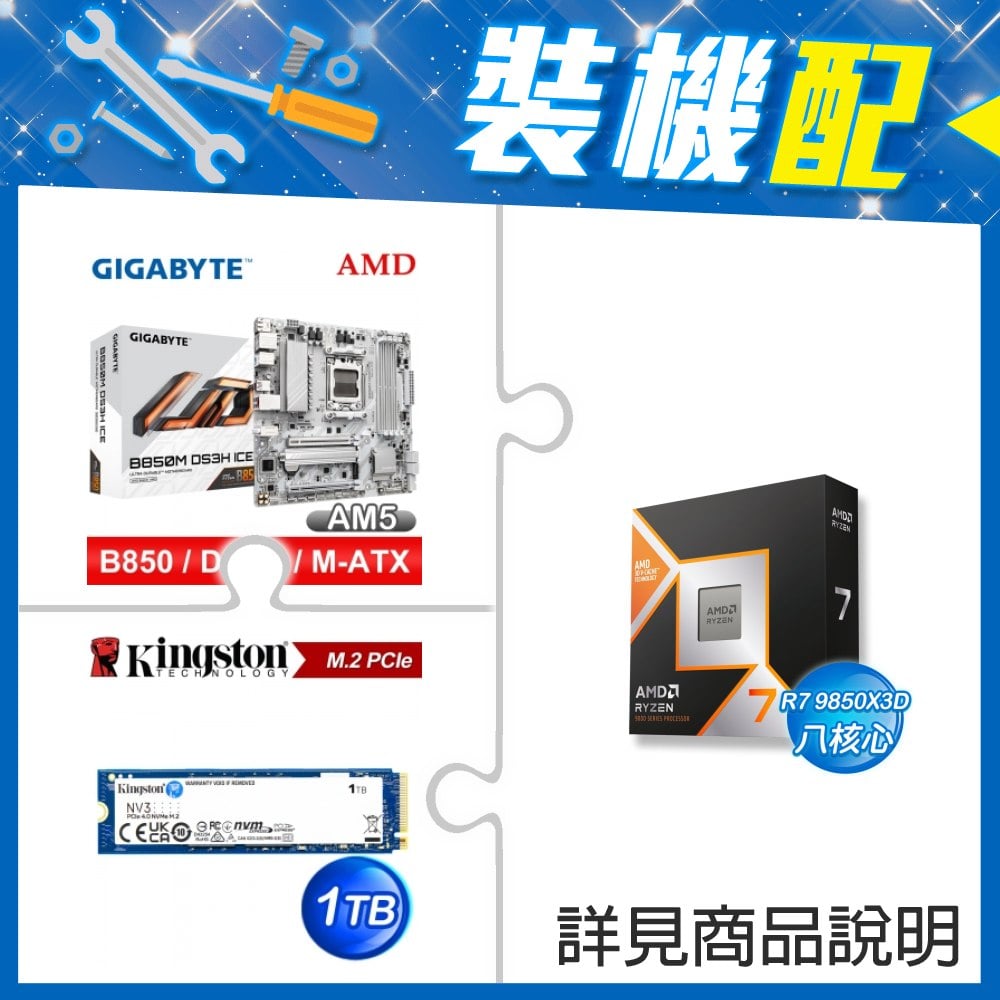 ☆裝機配★ AMD R7 9850X3D+技嘉 B850M DS3H ICE M-ATX主機板+金士頓 NV3 1TB M.2 PCIe SSD
