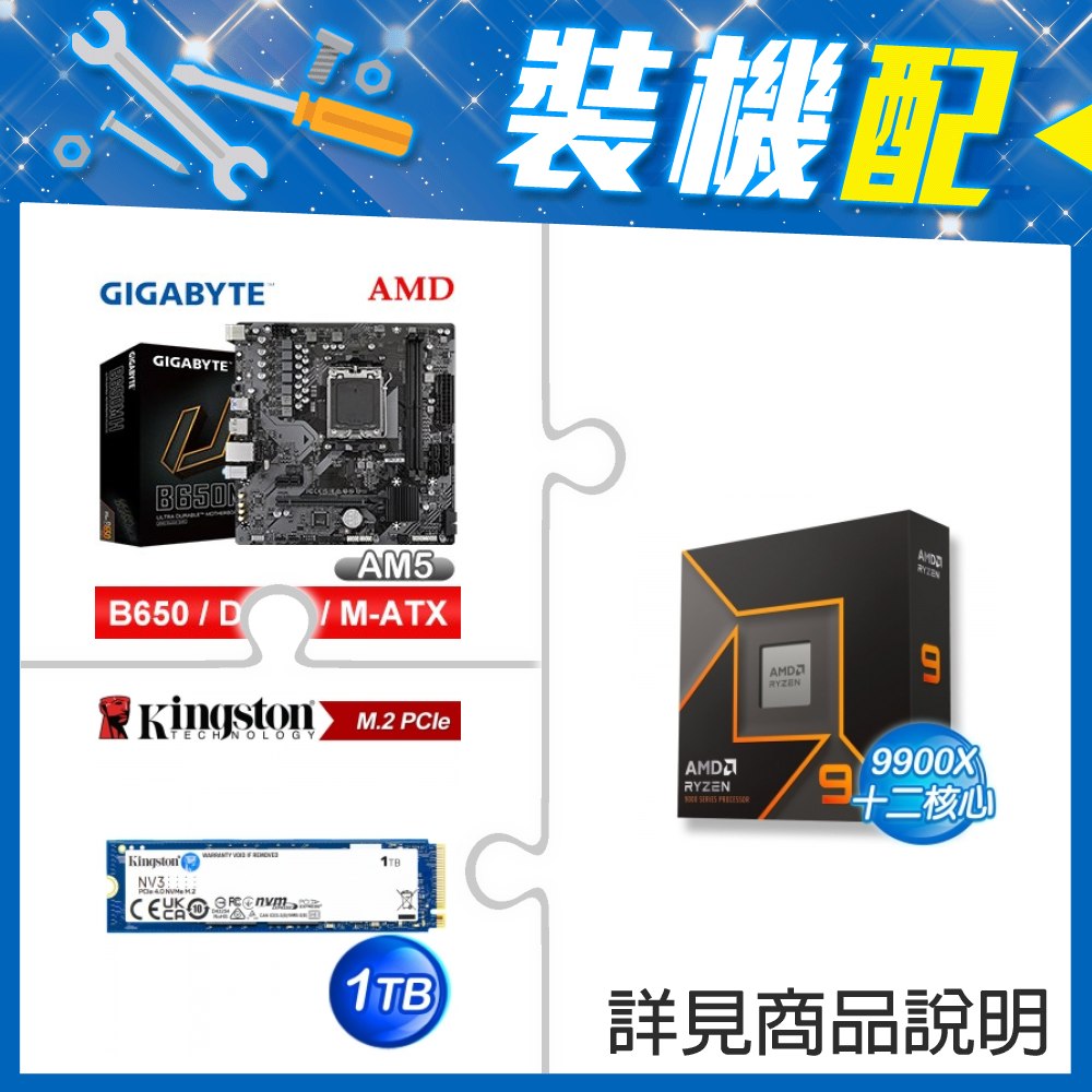 ☆裝機配★ AMD R9 9900X+技嘉 B650M H MATX主機板+金士頓 NV3 1TB M.2 PCIe SSD