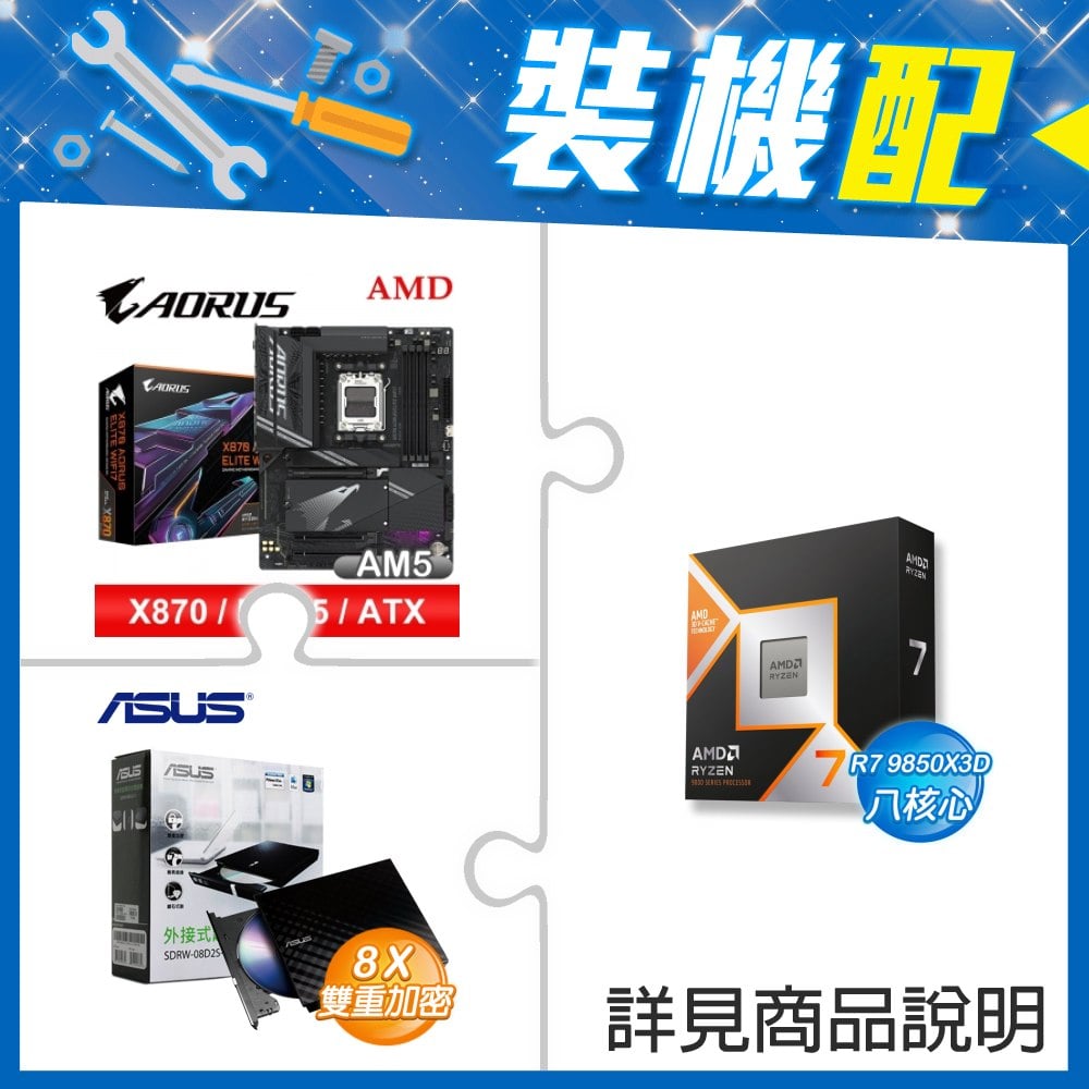 ☆裝機配★ AMD R7 9850X3D+技嘉 X870 AORUS ELITE WIFI7 ATX主機板+華碩 SDRW-08D2S-U 外接式燒錄機《黑》