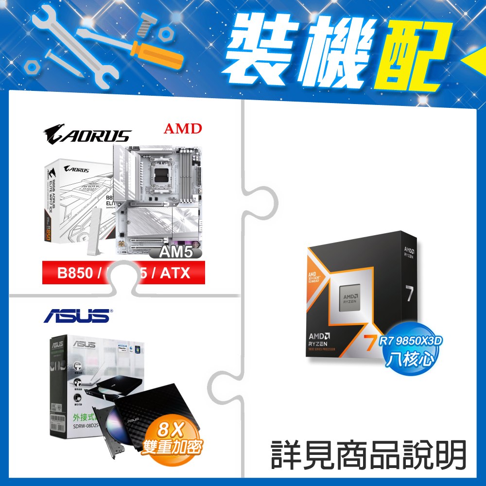 ☆裝機配★ AMD R7 9850X3D+技嘉 B850 AORUS ELITE WIFI7 ICE ATX主機板+華碩 SDRW-08D2S-U 外接式燒錄機《黑》