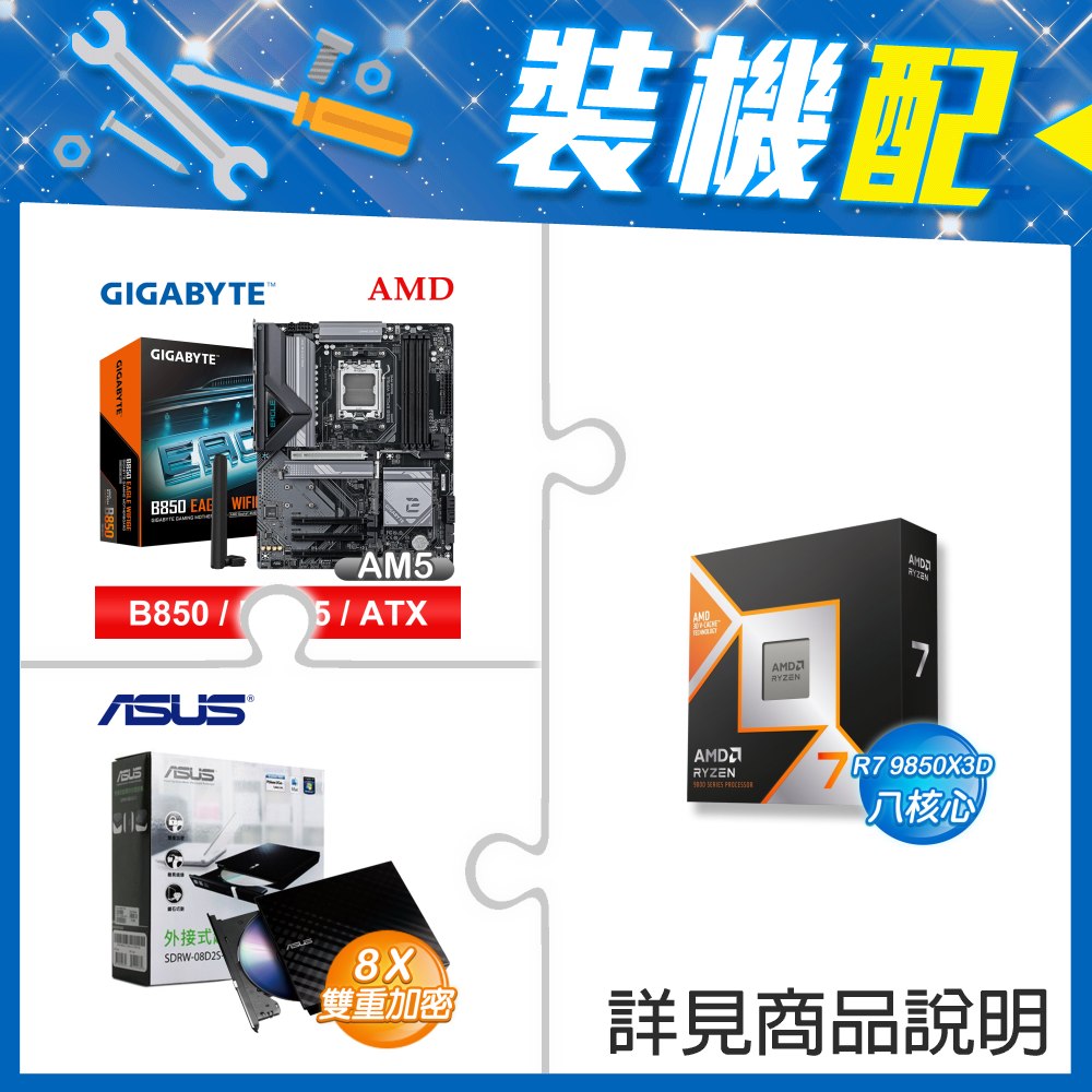 ☆裝機配★ AMD R7 9850X3D+技嘉 B850 EAGLE WIFI6E ATX主機板+華碩 SDRW-08D2S-U 外接式燒錄機《黑》