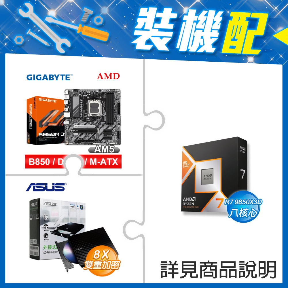 ☆裝機配★ AMD R7 9850X3D+技嘉 B850M DS3H ICE M-ATX主機板+華碩 SDRW-08D2S-U 外接式燒錄機《黑》
