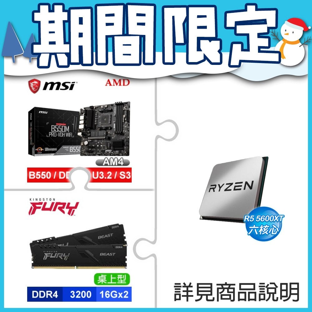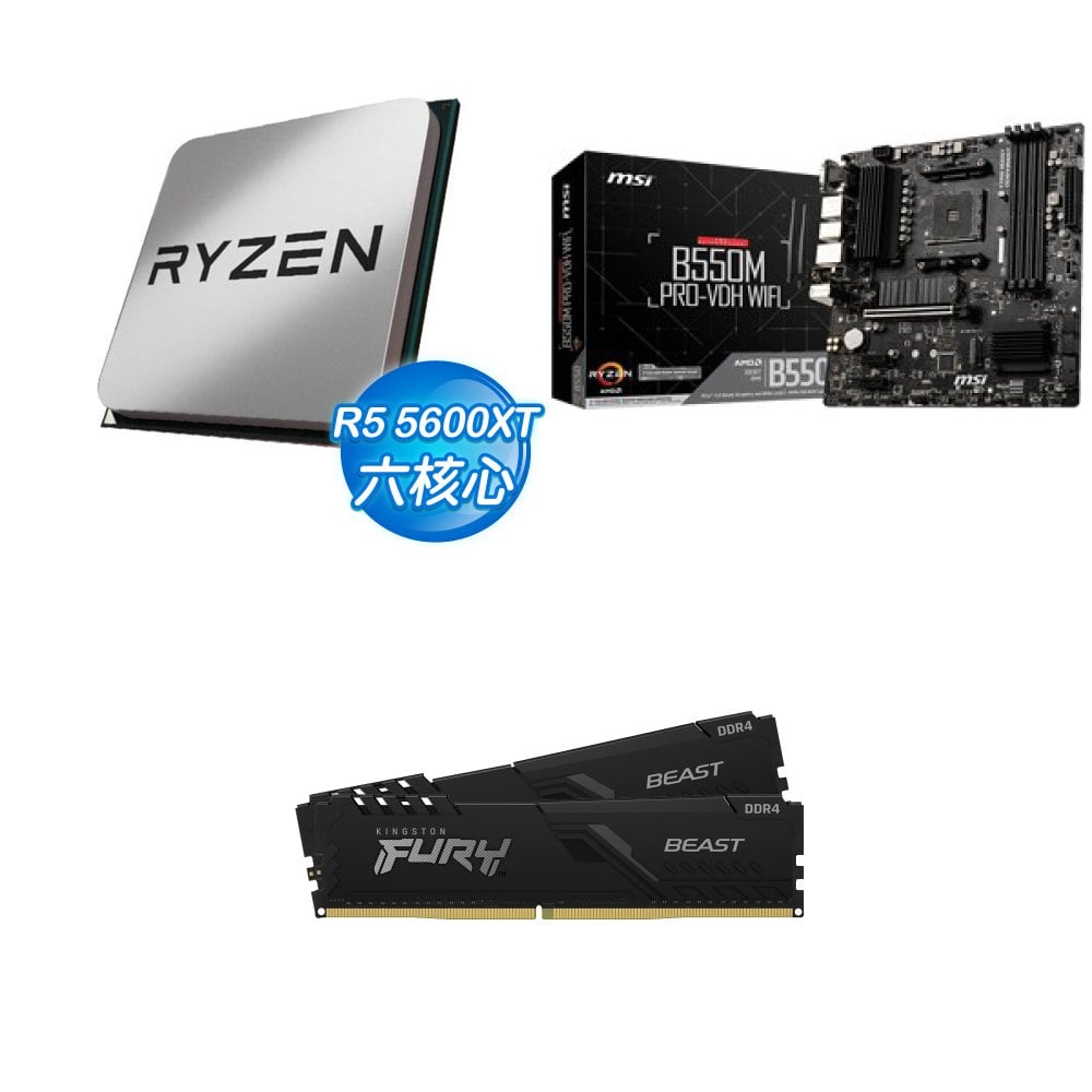 ☆期間限定★ AMD R5 5600XT MPK+微星 B550M PRO-VDH WIFI M-ATX主機板+金士頓 獸獵者 D4-3200 16G*2 CL16 黑 記憶體