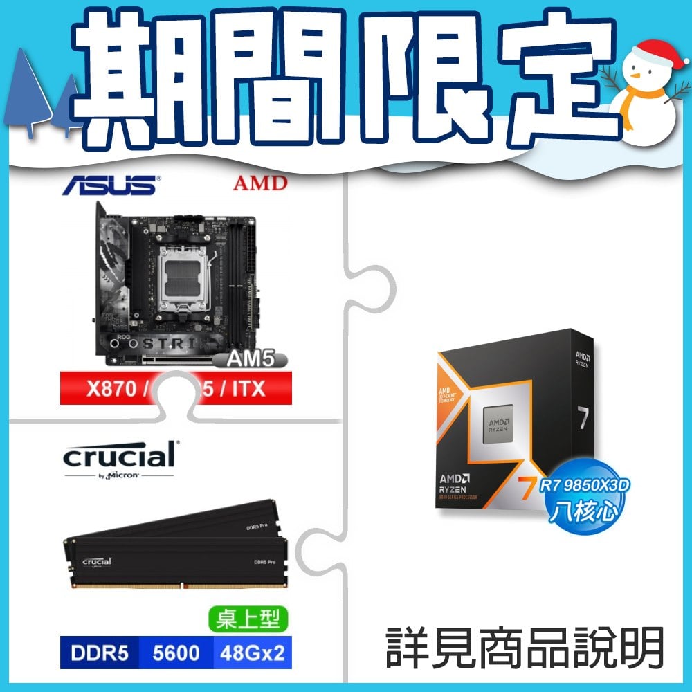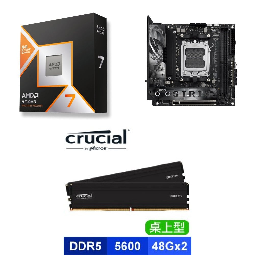 ☆期間限定★ AMD R7 9850X3D+華碩 ROG STRIX X870-I GAMING WIFI ITX主機板+美光 Crucial PRO DDR5 5600 96G (48G*2)黑 記憶體★送autobuy X AMD 不鏽鋼泡麵碗(含保溫袋)