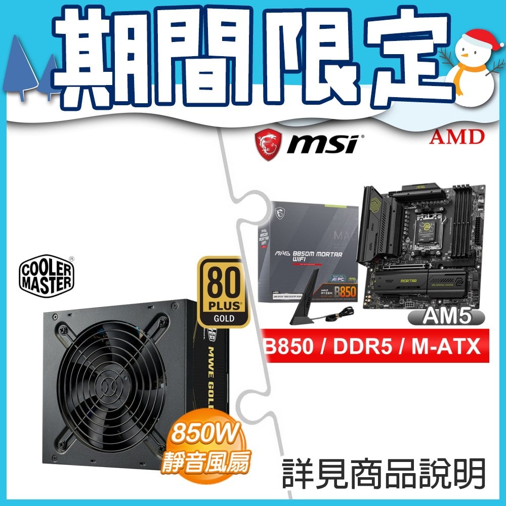 ☆期間限定★ 微星 MAG B850M MORTAR WIFI M-ATX主機板+酷碼 MWE Gold 850 V3 黑 金牌 直出 ATX3.1 電源供應器