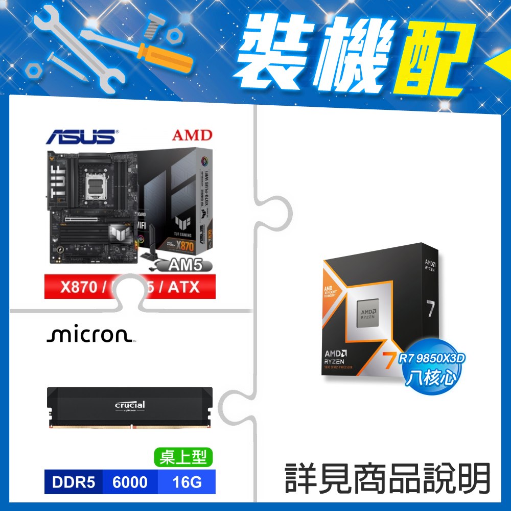 ☆裝機配★ AMD R7 9850X3D+華碩 TUF GAMING X870-PLUS WIFI ATX主機板+美光 Crucial PRO DDR5-6000 16G 記憶體