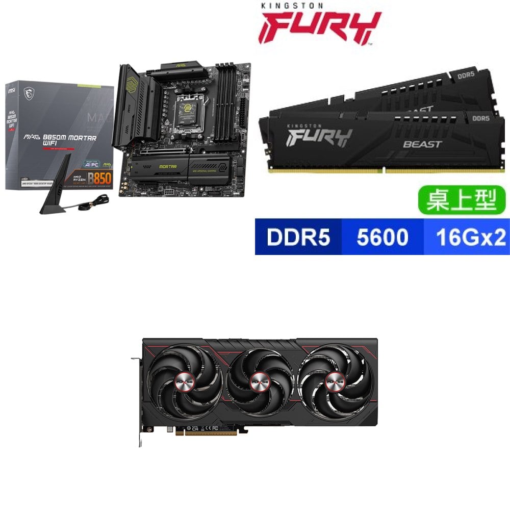 ☆期間限定★ 微星 MAG B850M MORTAR WIFI M-ATX主機板+金士頓 FURY Beast 獸獵者 D5 5600 16G*2 CL36 黑 KF556C36BBEK2-32 (支援XMP3.0、EXPO)記憶體+藍寶石 PULSE 脈動 RX 9070 XT GAMING 16GB 顯示卡