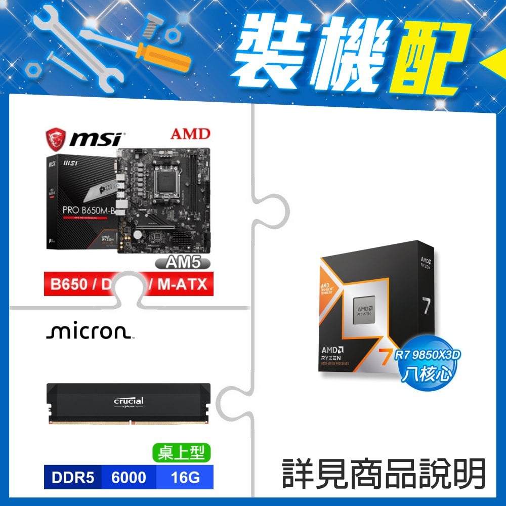 ☆裝機配★ AMD R7 9850X3D+微星 PRO B650M-B M-ATX主機板+美光 Crucial PRO DDR5-6000 16G 記憶體