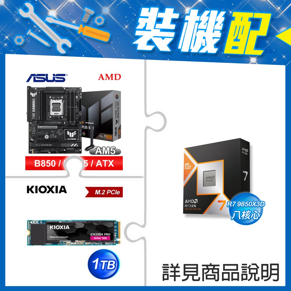 ☆裝機配★ AMD R7 9850X3D+華碩 TUF GAMING B850-PLUS WIFI ATX主機板+鎧俠 EXCERIA PRO 1TB PCIe Gen4x4 SSD