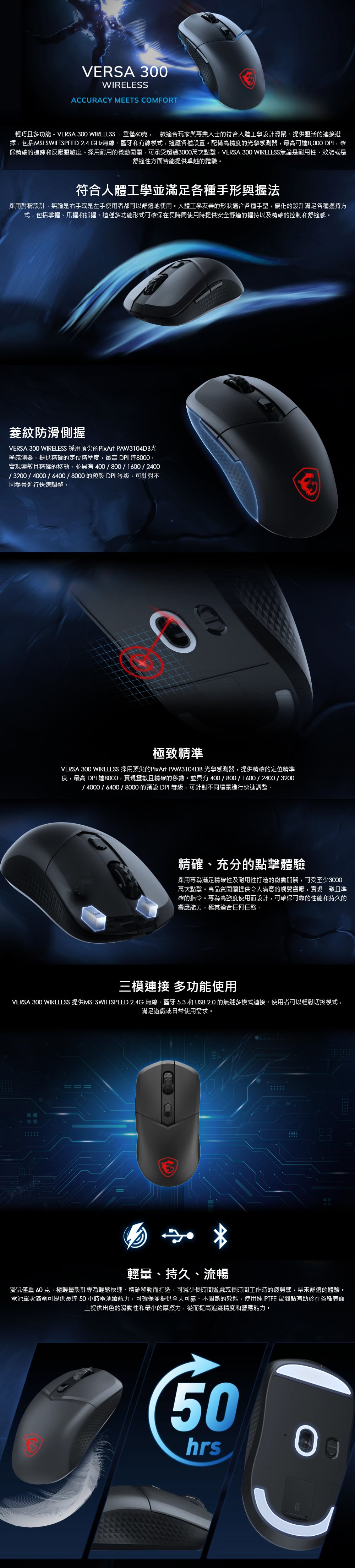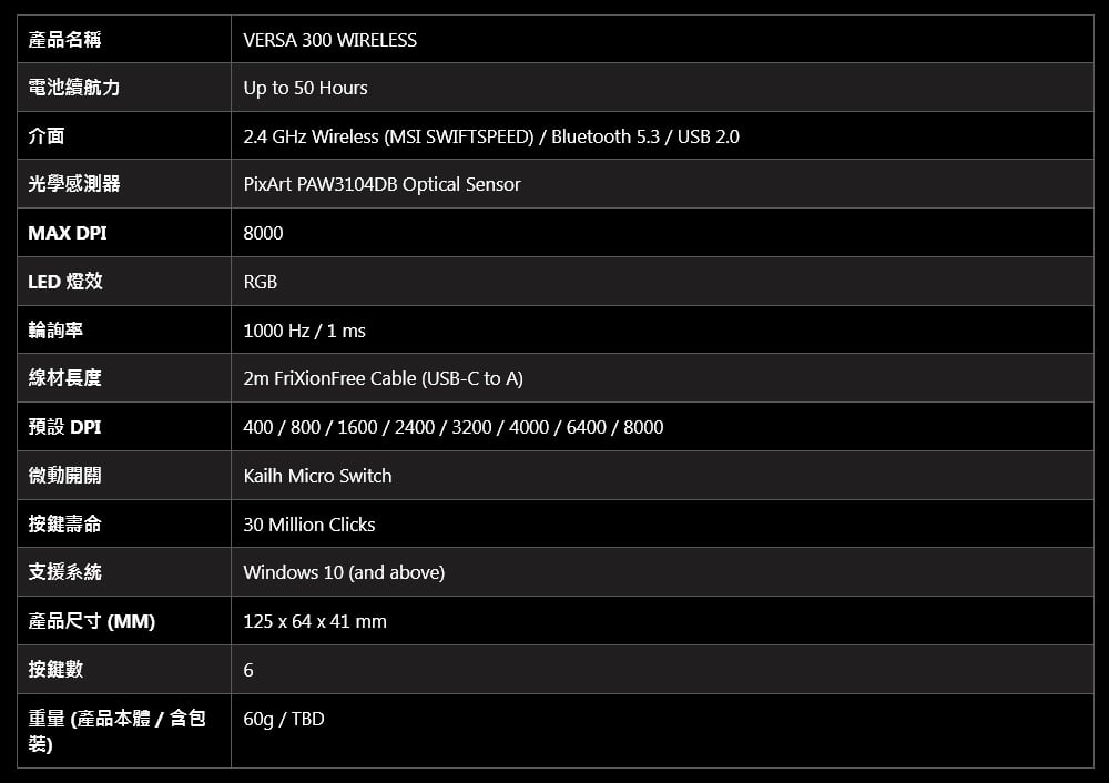 - 超輕量的舒適感 - VERSA 300 WIRELESS僅60g重,非常適合快節奏的遊戲,實現輕鬆移動,提升靈活性和準確性