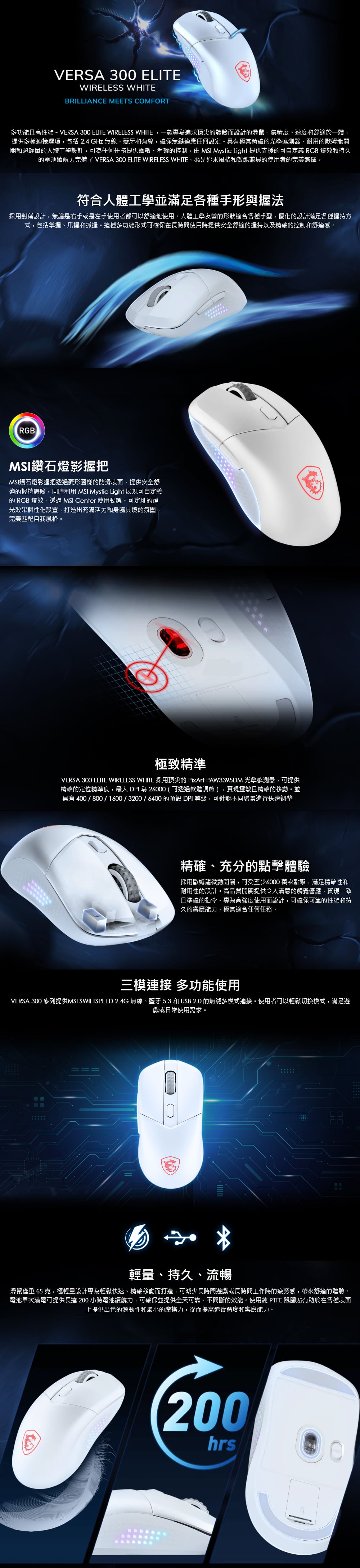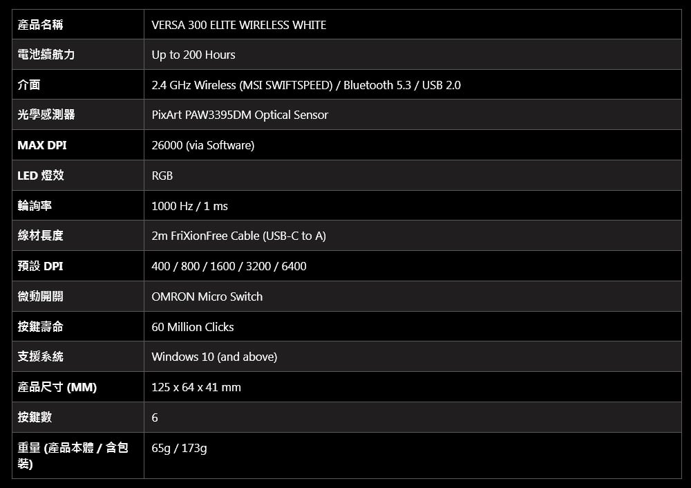 - 超輕量舒適 - VERSA 300 ELITE WIRELESS WHITE 僅 65 g重,非常適合輕鬆移動的快節奏遊戲,提高敏捷性和準確性