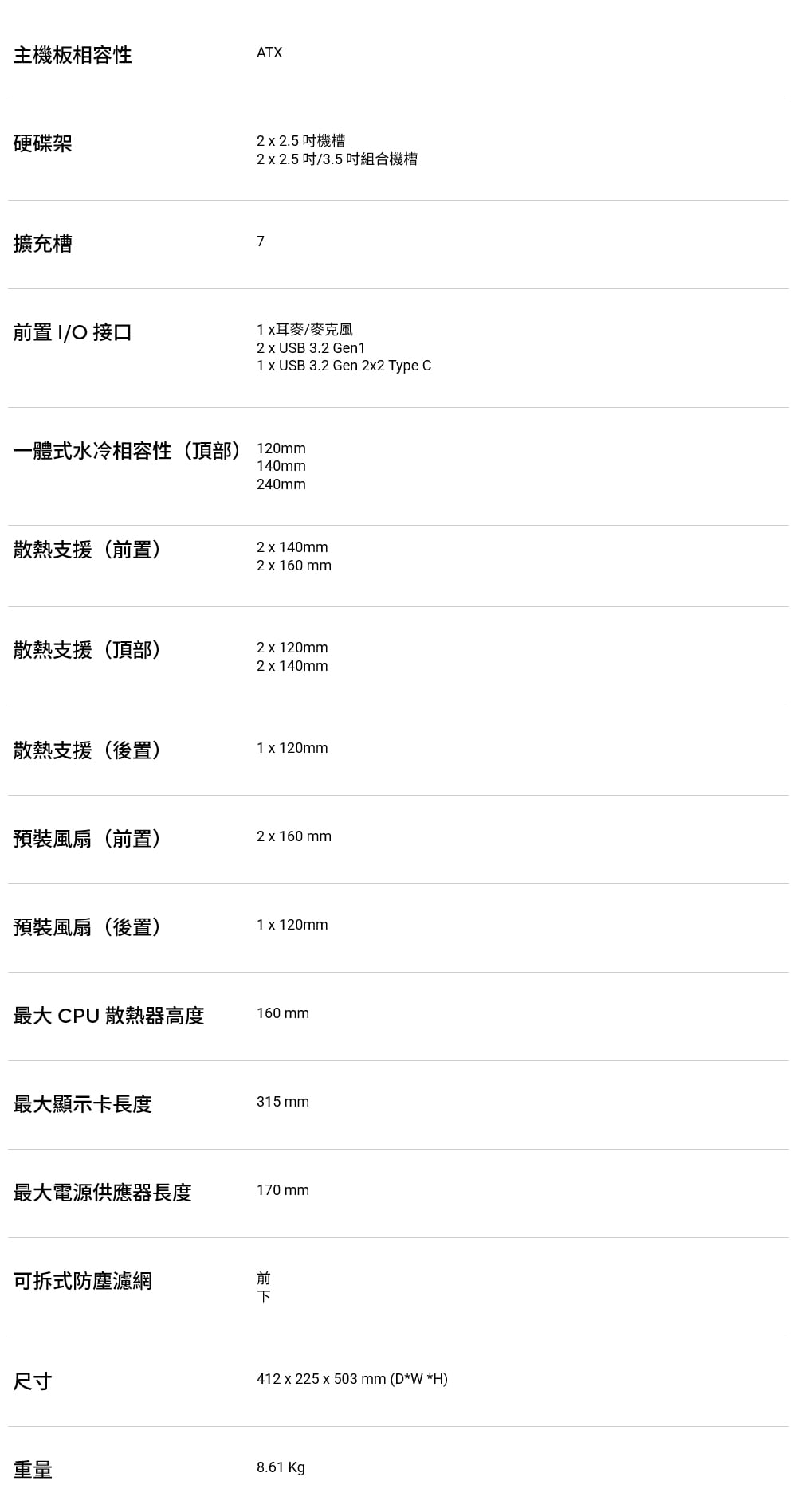 - 優異的散熱效能:獨特的雙 160 x 32mm 前環風扇葉片可提供高達 138cfm 的氣流