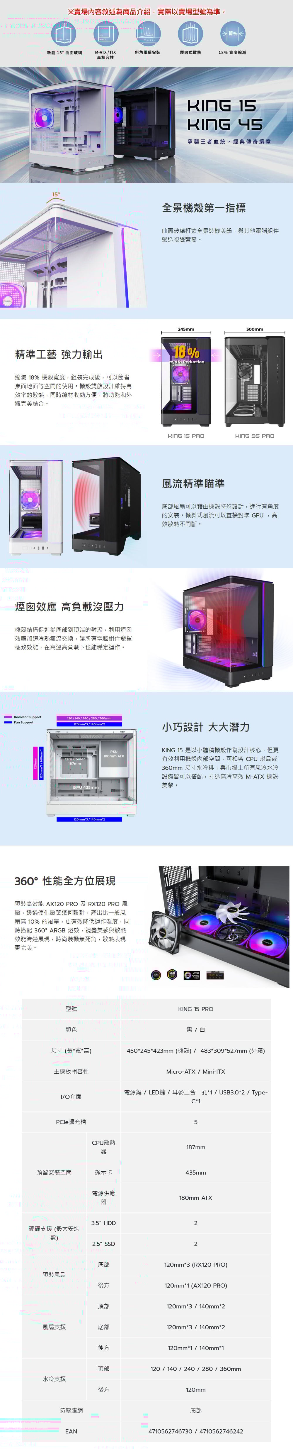 MONTECH 君主【KING 15 PRO】曲面玻璃透側 M-ATX機殼《白》(顯卡43.5/CPU高18.7)