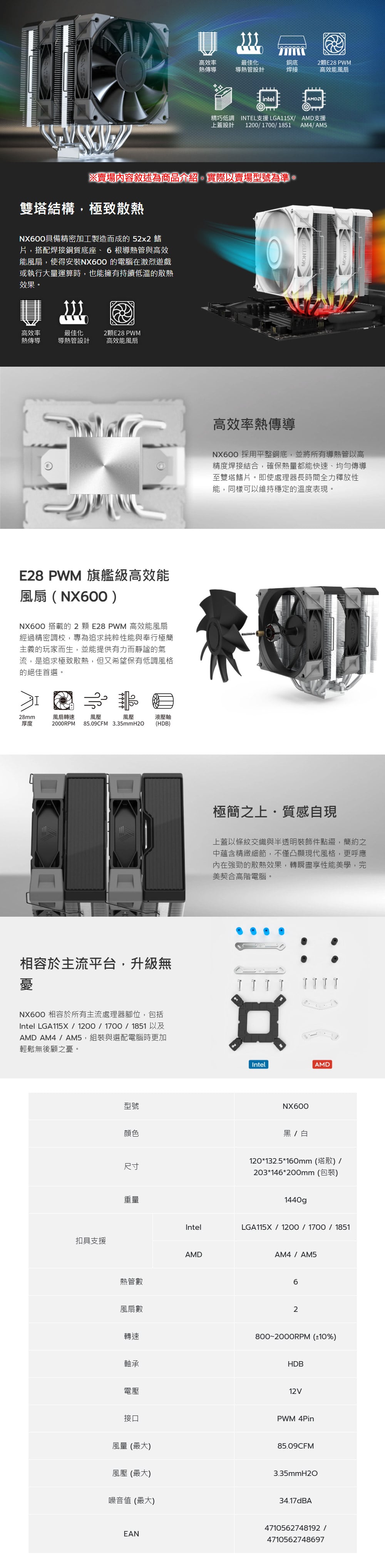MONTECH 君主 NX600 6導管 雙塔雙風扇《白》(高16cm)
