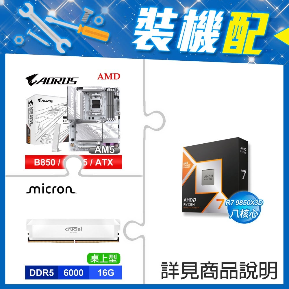 ☆裝機配★ AMD R7 9850X3D+技嘉 B850 AORUS ELITE WIFI7 ATX主機板+美光 Crucial PRO DDR5-6000 16G 記憶體