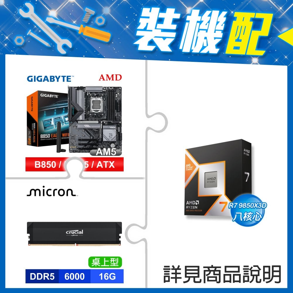 ☆裝機配★ AMD R7 9850X3D+技嘉 B850 EAGLE WIFI6E ATX主機板+美光 Crucial PRO DDR5-6000 16G 記憶體