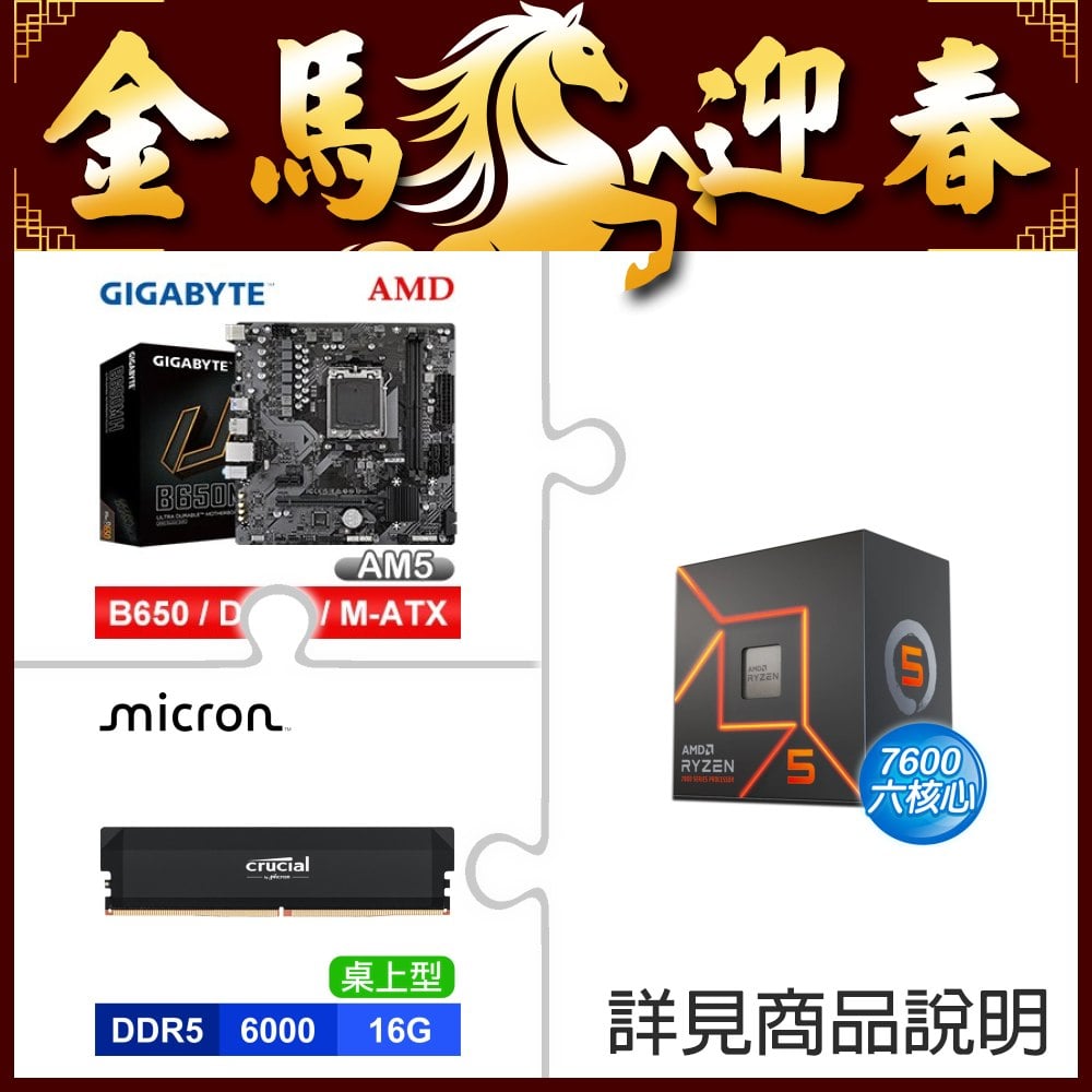 ☆期間限定★ AMD R5 7600+技嘉 B650M H M-ATX主機板+美光 Crucial PRO DDR5 6000 16G CL36 黑 記憶體