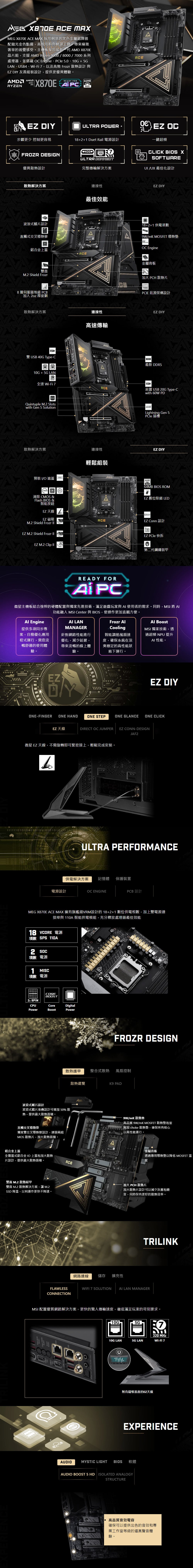 - 散熱護甲設計 : 波浪式鰭片設計、直觸交叉導熱管、MOSFET 底板, 9W/mK MOSFET 散熱墊片、雙面 M.2 Shield Frozr 散熱鎧甲和AI 軟體,提供出色的散熱效果