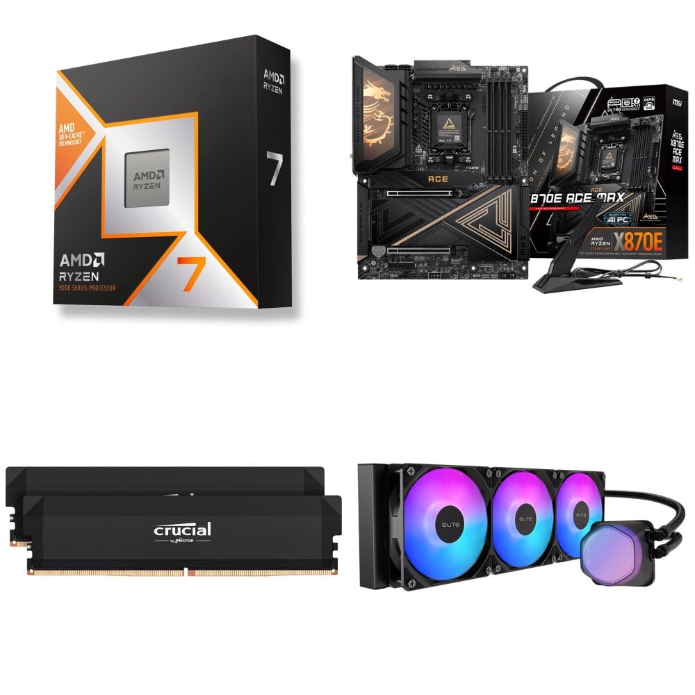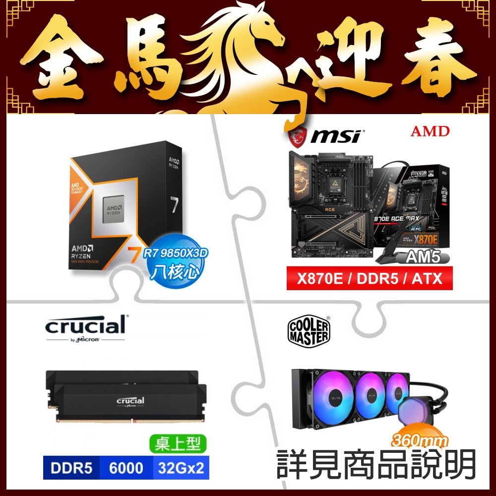 ☆期間限定★ AMD R7 9850X3D+微星 MEG X870E ACE MAX ATX AM5主機板+美光 Crucial PRO DDR5 6000 64G (32G*2)黑 記憶體+酷碼 EliteLiquid 360 ARGB 水冷散熱器