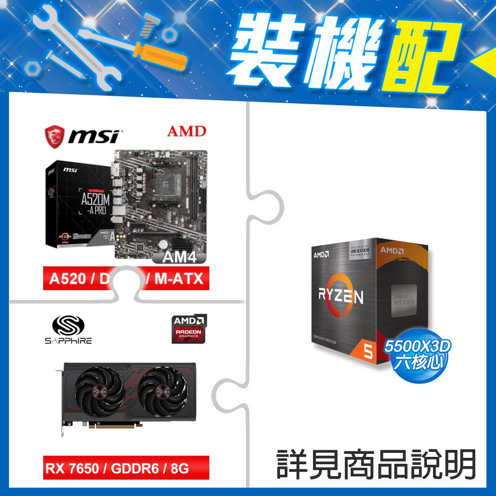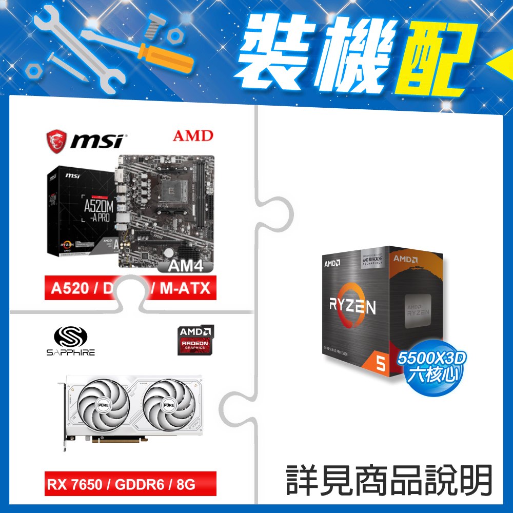 ☆裝機配★ AMD R5 5500X3D+微星 A520M-A PRO M-ATX主機板+藍寶石 PULSE 白金版 RX 7650 GRE GAMING 8GB 顯示卡