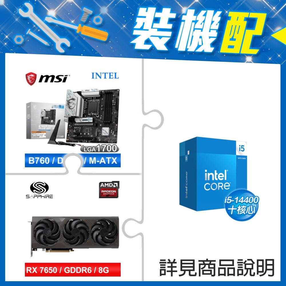 ☆裝機配★ i5-14400F+微星 B760M GAMING PLUS WIFI D4 MATX主機板+藍寶石 PURE 極地 RX 7650 GRE GAMING 8GB 顯示卡