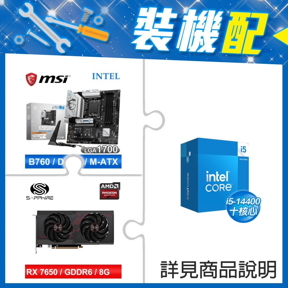 ☆裝機配★ i5-14400+微星 B760M GAMING PLUS WIFI D4 MATX主機板+藍寶石 PURE 極地 RX 7650 GRE GAMING 8GB 顯示卡