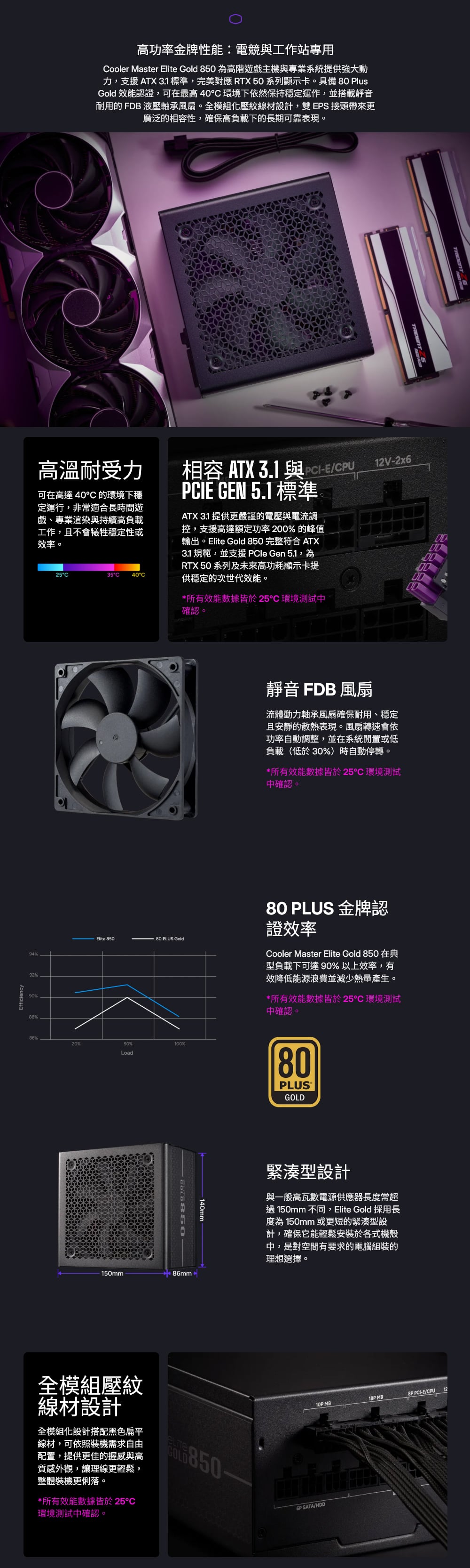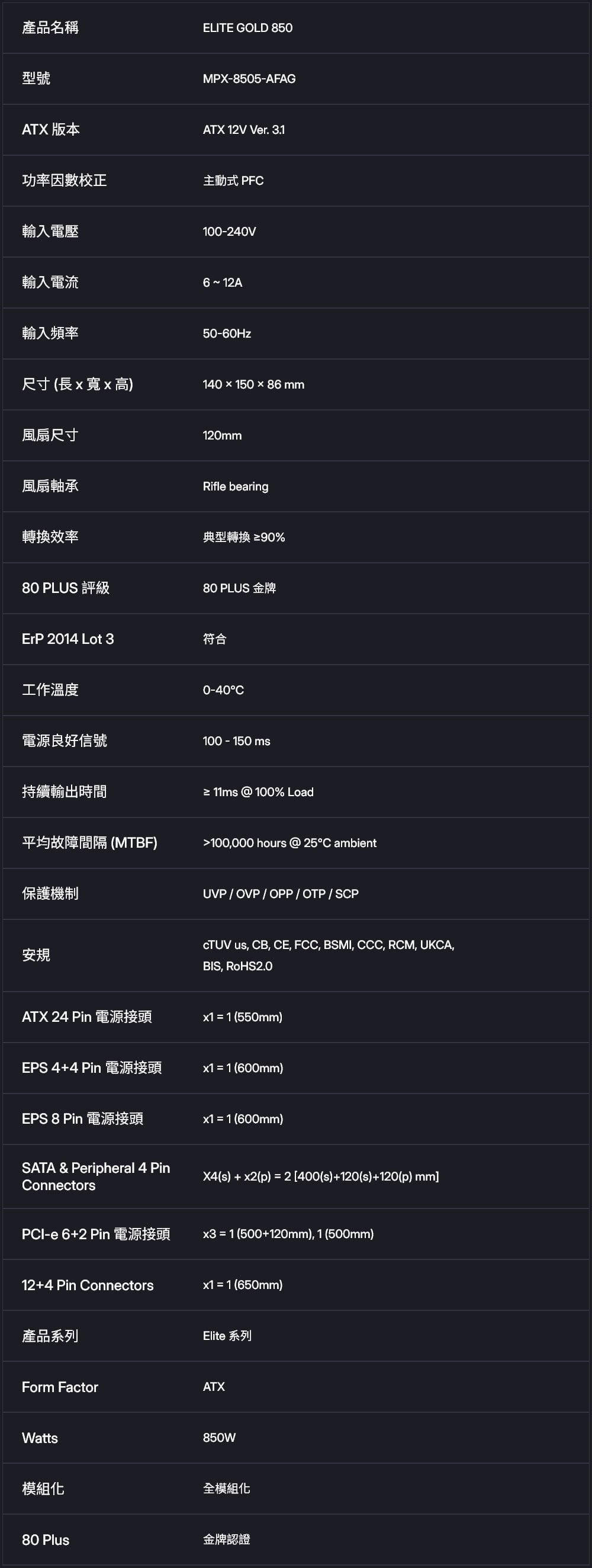 Cooler Master 酷碼 ELITE Gold 850W 金牌 全模組 ATX3.1 PCIe 5.1 電源供應器(10年保)