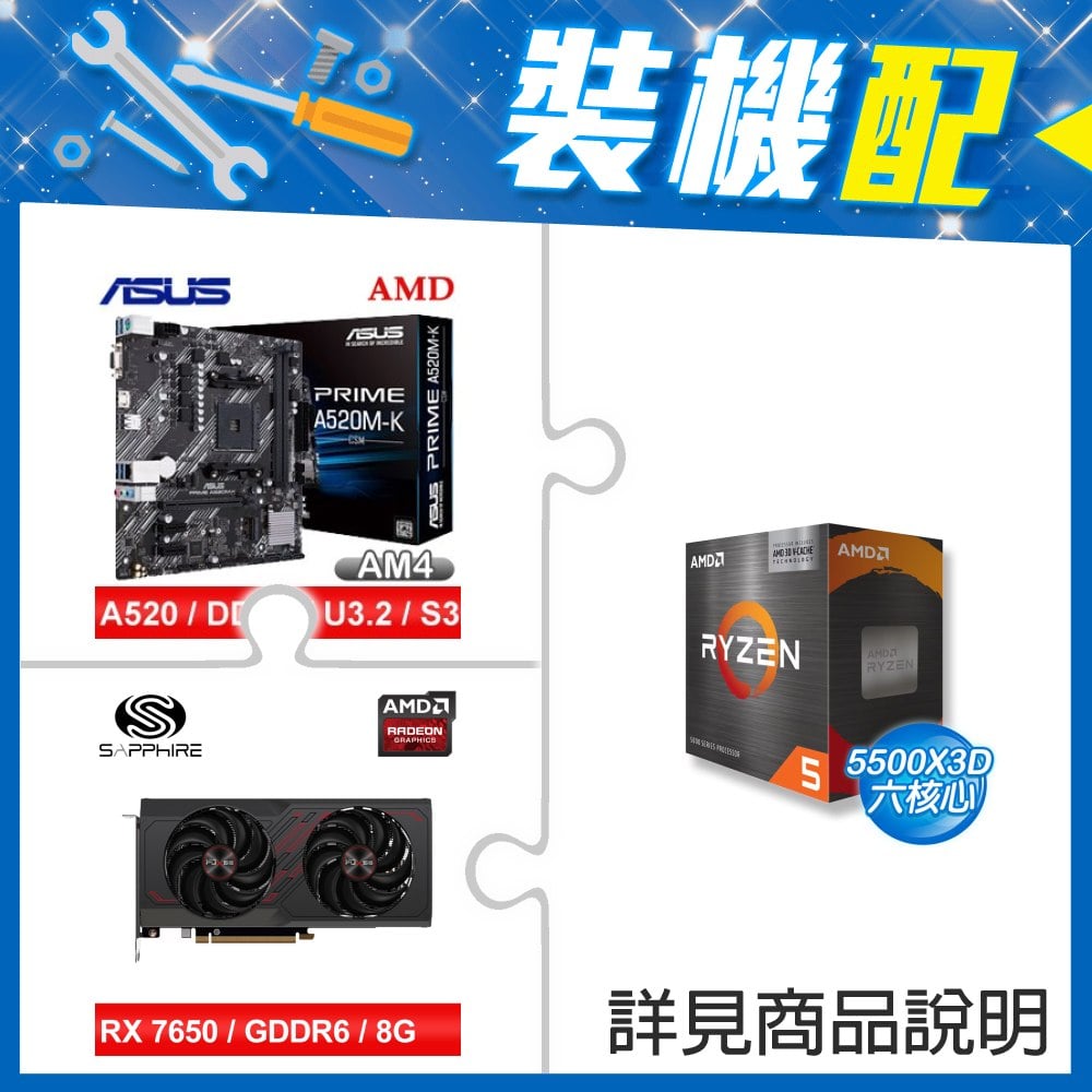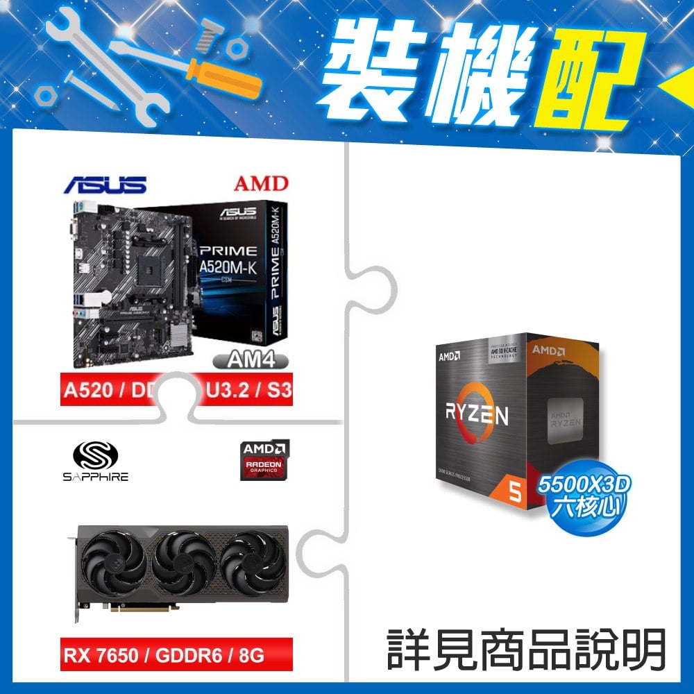 ☆裝機配★ AMD R5 5500X3D+華碩 PRIME A520M-K CSM M-ATX 主機板+藍寶石 黑鑽版 RX 7650 GRE GAMING OC 8GB 顯示卡
