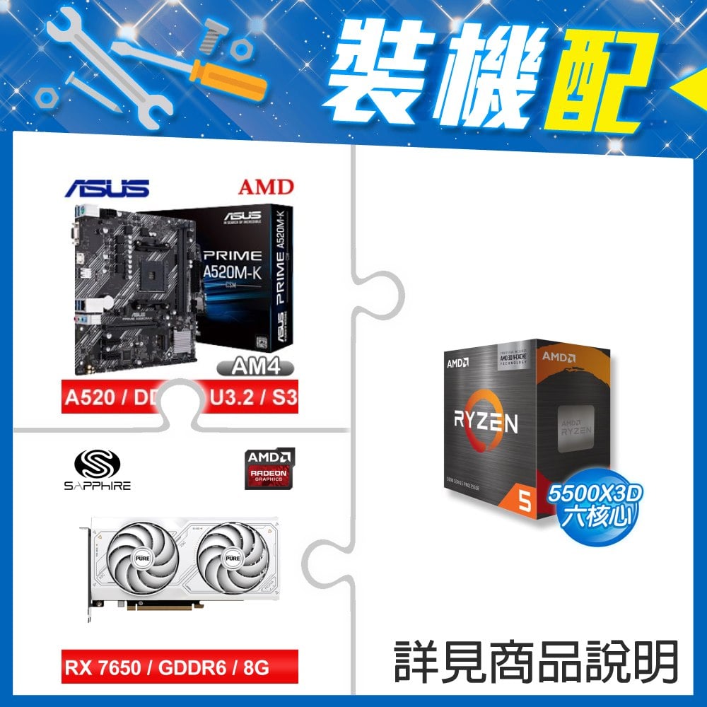 ☆裝機配★ AMD R5 5500X3D+華碩 PRIME A520M-K CSM M-ATX 主機板+藍寶石 PURE 極地 RX 7650 GRE GAMING 8GB 顯示卡