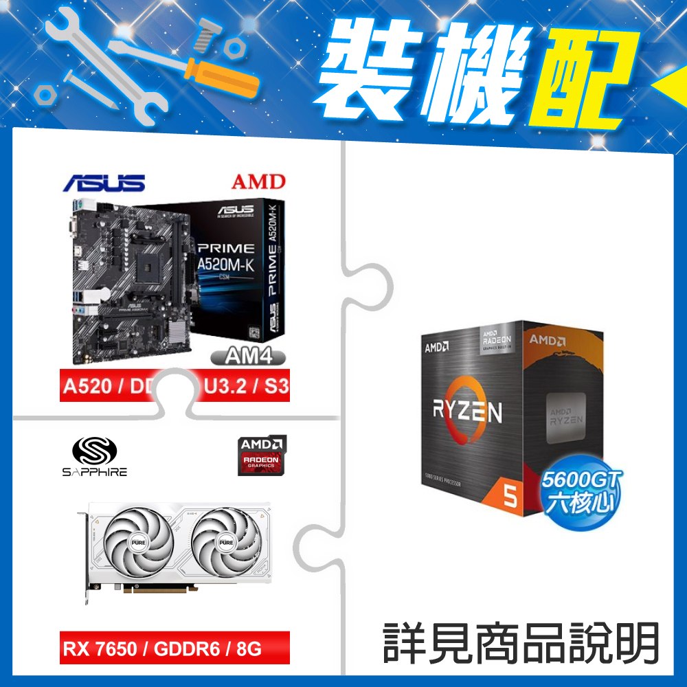 ☆裝機配★ AMD R5 5600GT+華碩 PRIME A520M-K CSM M-ATX 主機板+藍寶石 PURE 極地 RX 7650 GRE GAMING 8GB 顯示卡