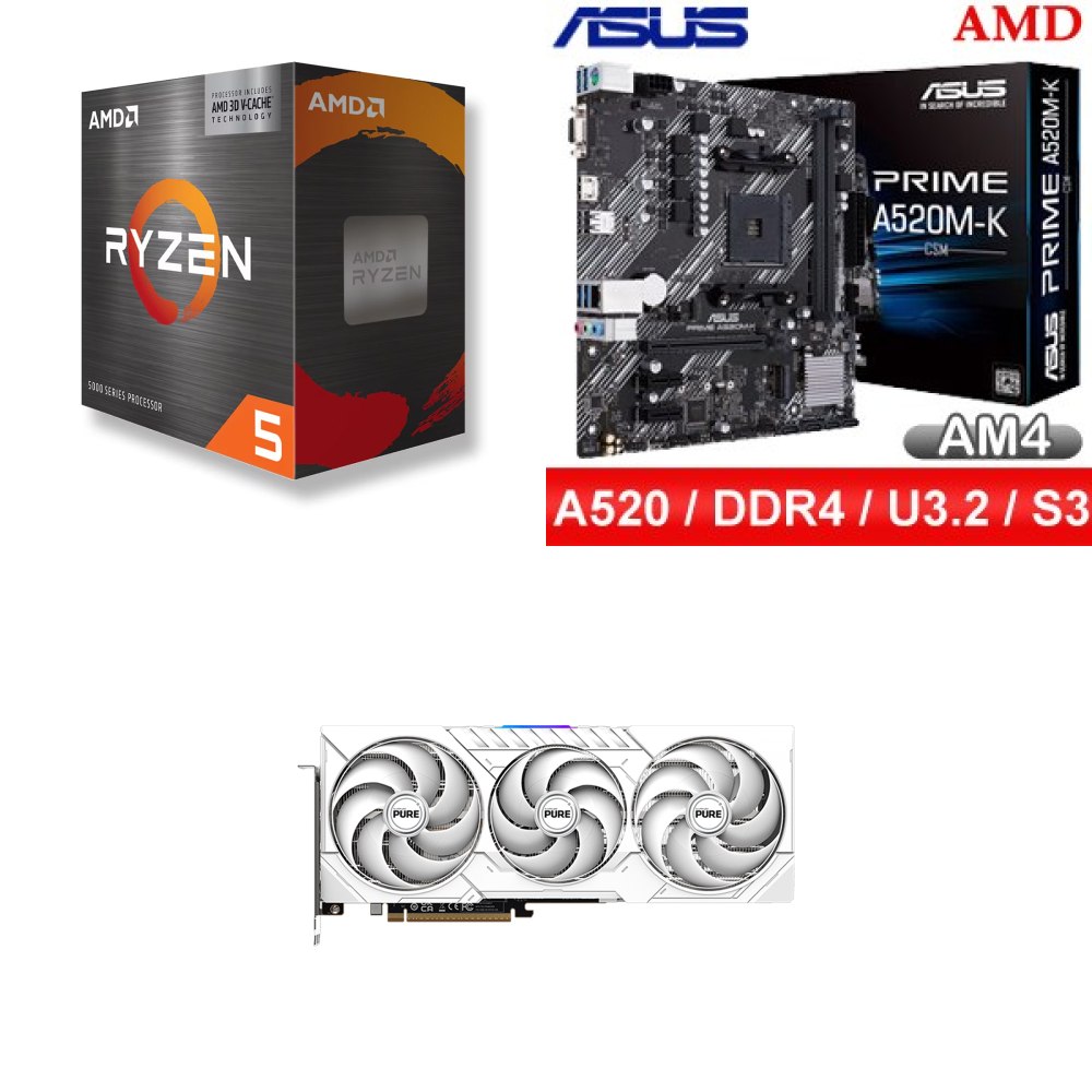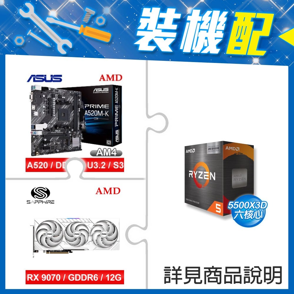 ☆裝機配★ AMD R5 5500X3D+華碩 PRIME A520M-K CSM M-ATX 主機板+藍寶石 PURE 極地 RX 9070 GRE GAMING OC 12GB 顯示卡