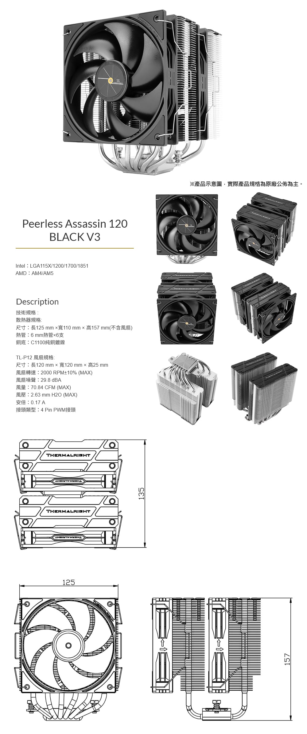 Thermalright 利民 Peerless Assassin 120 Black V3 6導管 245W 雙塔雙風扇 散熱器(高15.7)