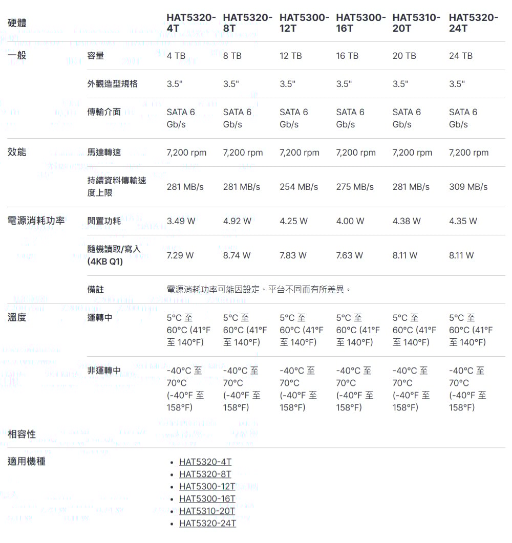 Synology 群暉 HAT5320 企業級 24T 3.5吋 7200轉 1GB NAS硬碟(5年保)