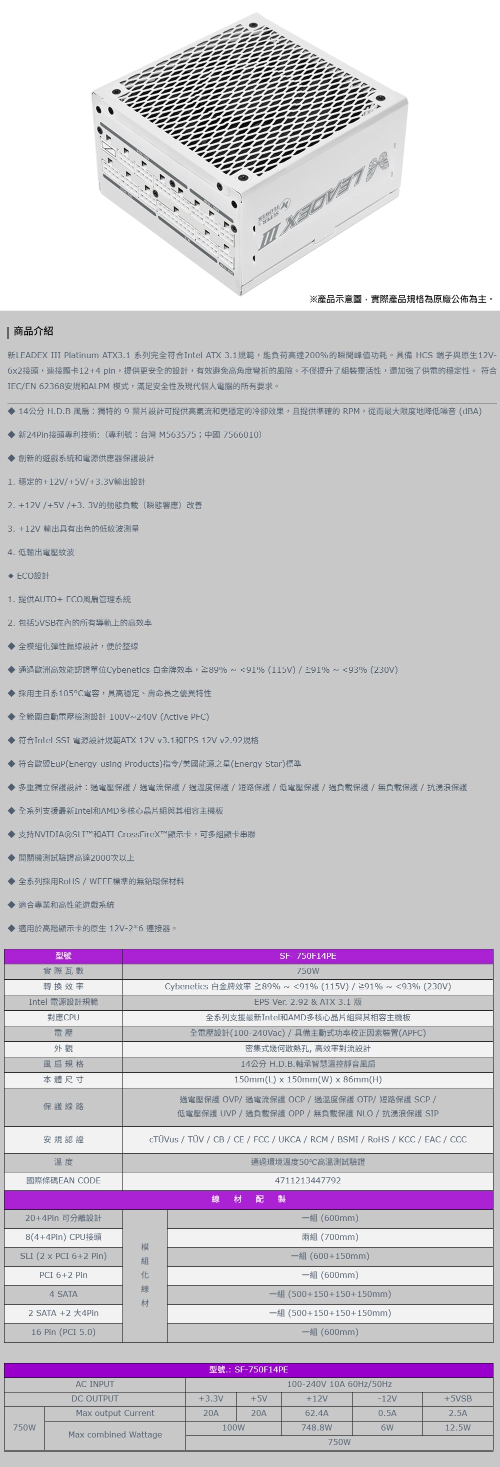 Super Flower 振華 LEADEX III 750W 白金牌 全模組 ATX3.1 PCIe 5.1 主日系 電源供應器《白》(10年保)