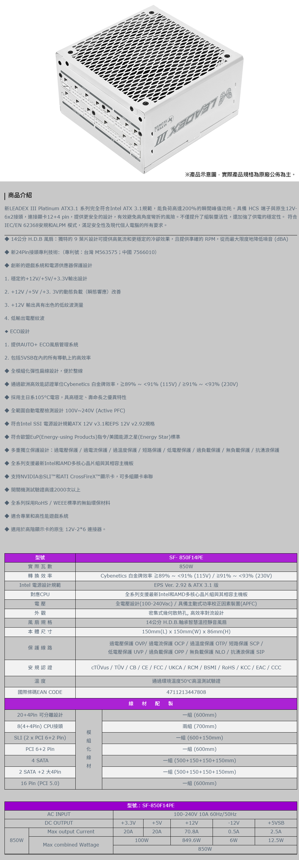 - 符合Intel SSI 電源設計規範ATX 12V v3.1和EPS 12V v2.92規格