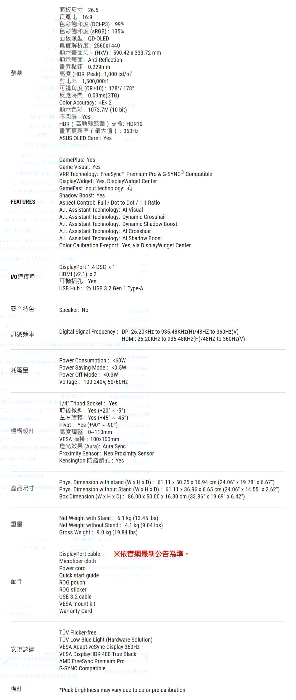 - 27 吋 QHD (2560 x 1440) QD-OLED 電競螢幕,具備 360Hz 更新率和 0.03ms 反應時間