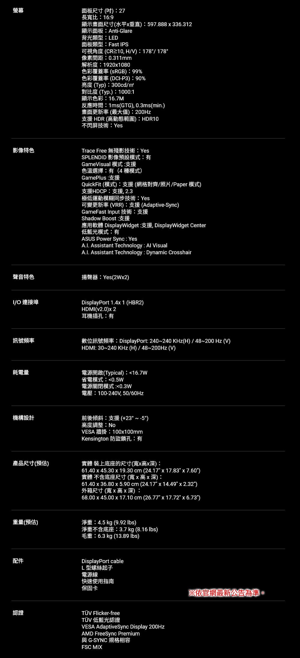 • 27 吋 Full HD(1920 x 1080) Fast IPS 面板,具備 200Hz 更新率,為快節奏的遊戲而設計