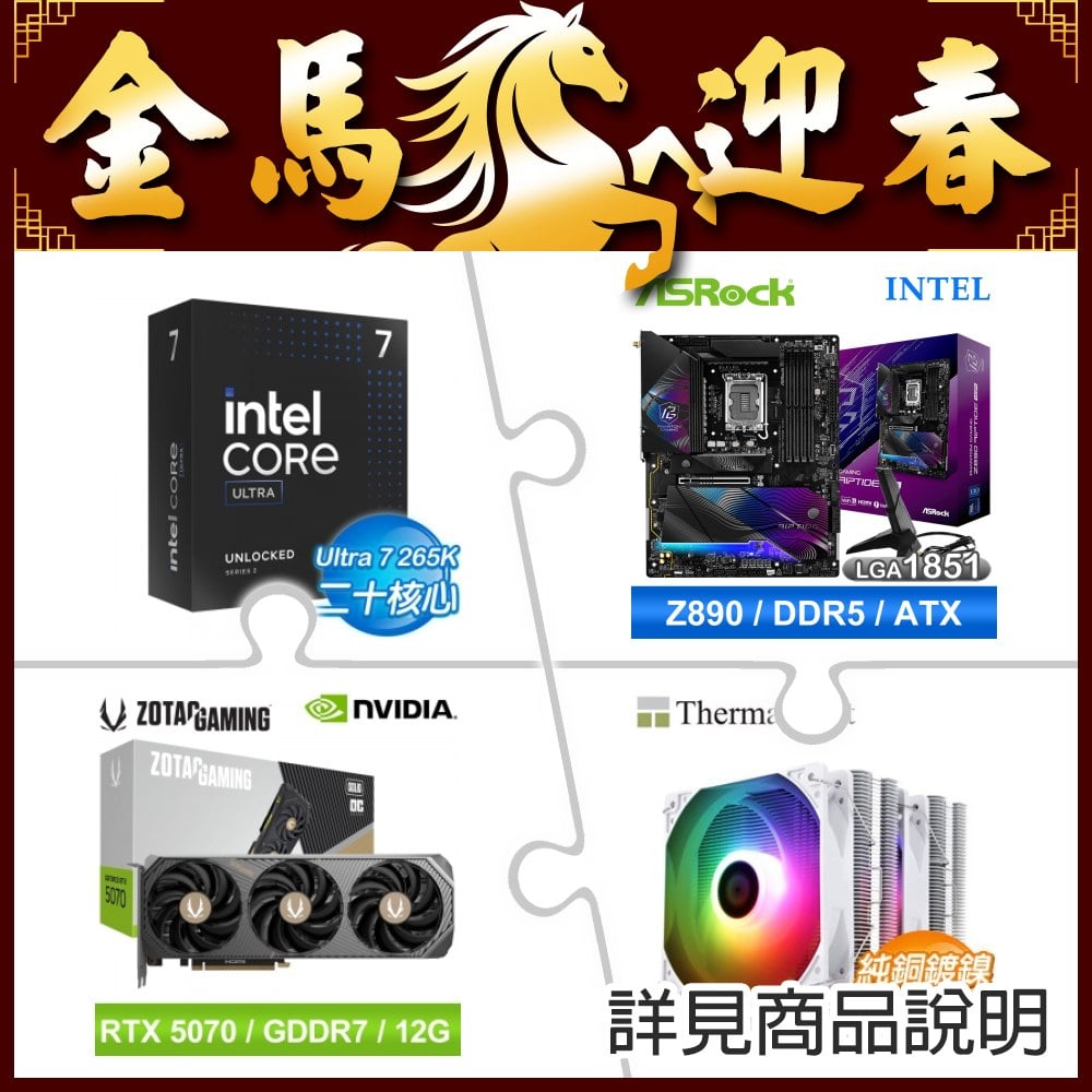 ☆期間限定★ Intel Core Ultra 7 265K+華擎 Z890 Riptide WiFi D5 ATX主機板+索泰 RTX 5070 SOLID OC 12G 顯示卡+利民 Peerless Assassin 120 SE White ARGB 水冷