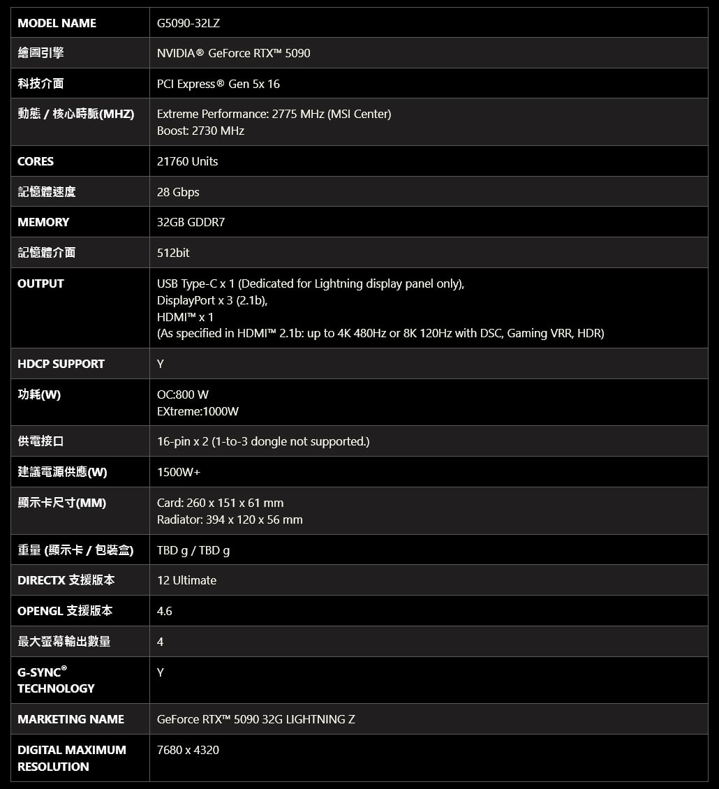 MSI 微星 RTX 5090 32G LIGHTNING Z 顯示卡